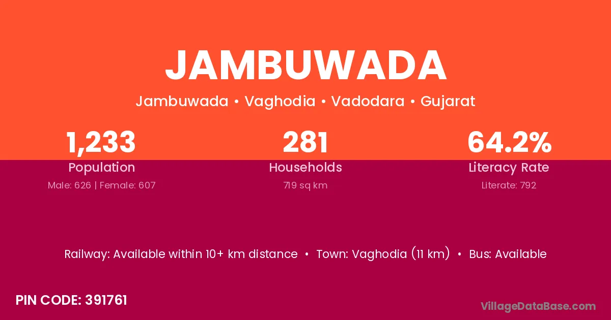 Vaghodia (11 km) is the nearest town to Jambuwada village for major economic activities and is located approximately 11 km away.