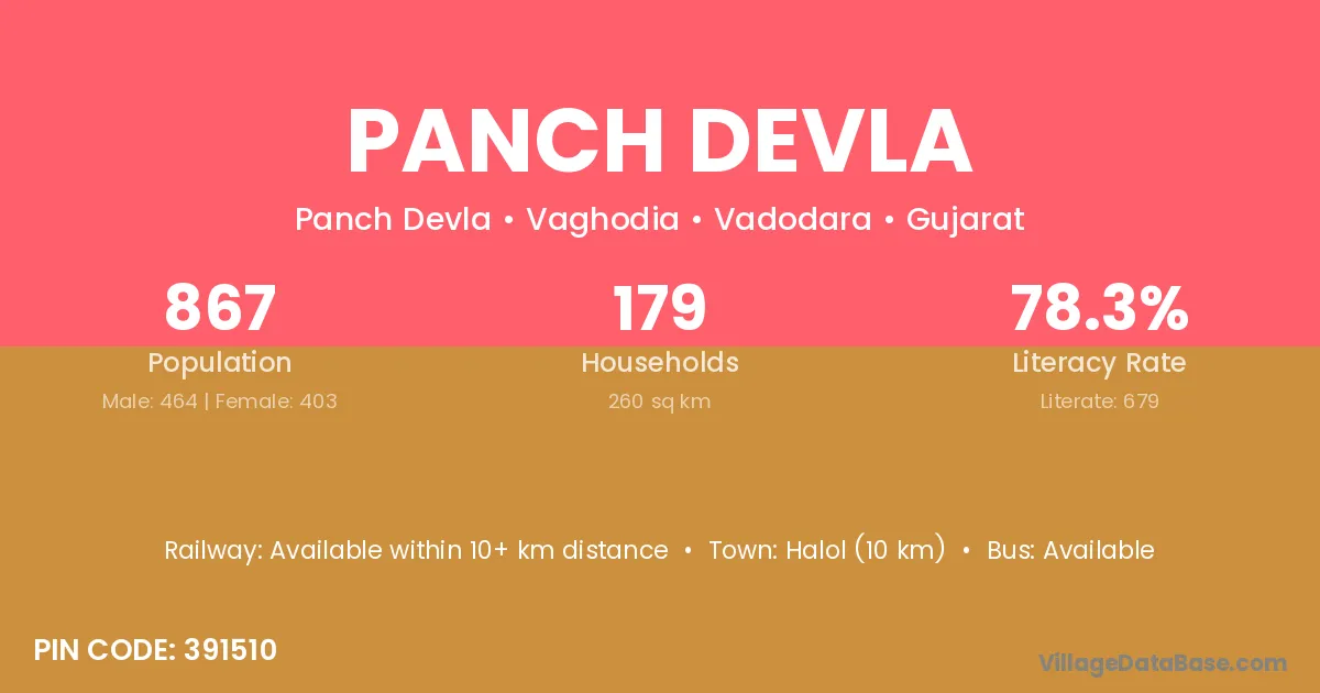Halol (10 km) is the nearest town to Panch Devla village for major economic activities and is located approximately 10 km away.