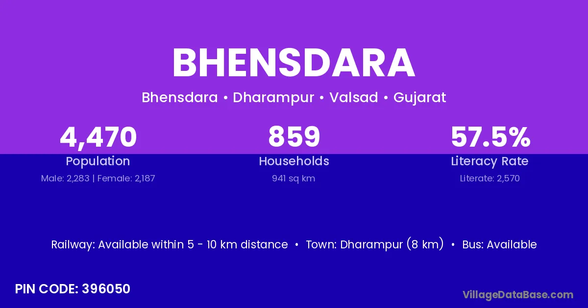 According to Census 2011 information, the village code of Bhensdara village is 396050.