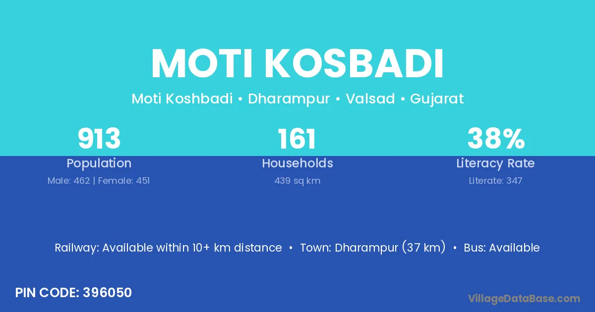 Moti Kosbadi village has a total population of 913 people, of which 462 are males and 451 are females.
