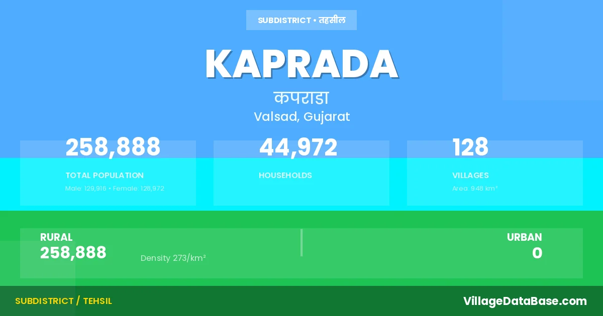 According to the 2011 census The total area of Kaprada Taluka is 948 km², with a population of 258888 people. The population density is 273 inhabitants per square kilometre, and there are approximately 44972 houses in the sub district.