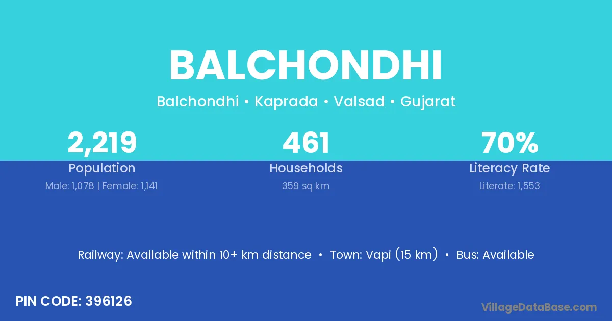 Vapi (15 km) is the nearest town to Balchondhi village for major economic activities and is located approximately 15 km away.
