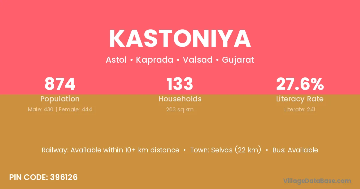 According to Census 2011 information, the village code of Kastoniya village is 396126.