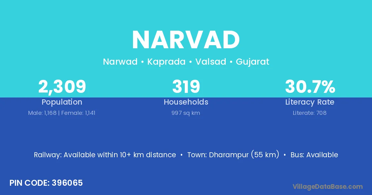 Dharampur (55 km) is the nearest town to Narvad village for major economic activities and is located approximately 55 km away.