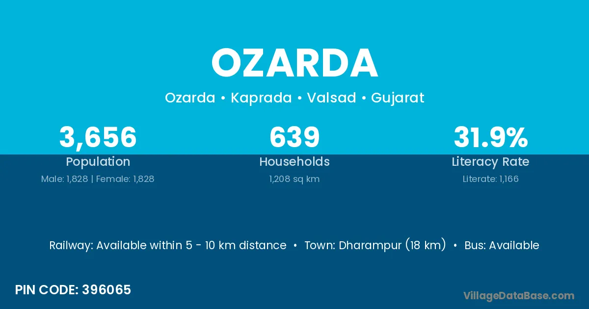 Dharampur (18 km) is the nearest town to Ozarda village for major economic activities and is located approximately 18 km away.