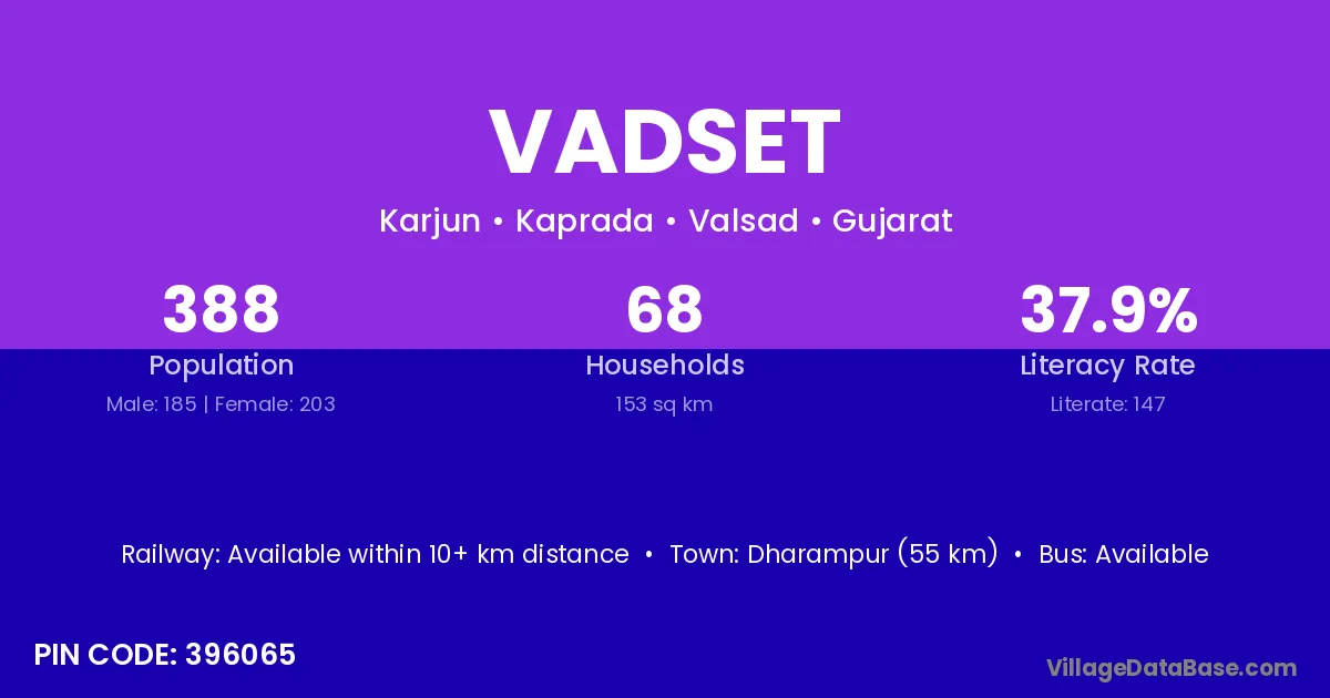 Dharampur (55 km) is the nearest town to Vadset village for major economic activities and is located approximately 55 km away.
