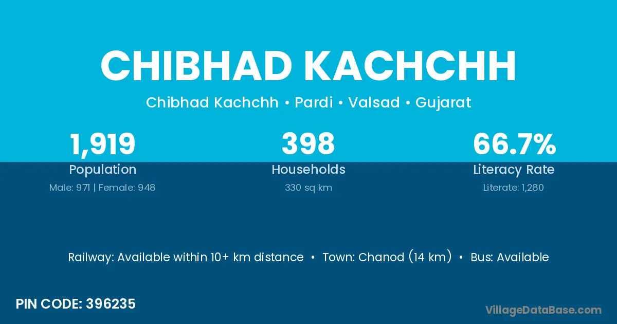 Chibhad Kachchh village has a total population of 1,919 people, of which 971 are males and 948 are females.