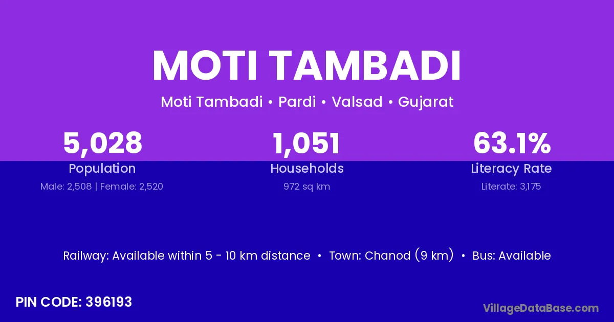 Moti Tambadi village has a total population of 5,028 people, of which 2,508 are males and 2,520 are females.