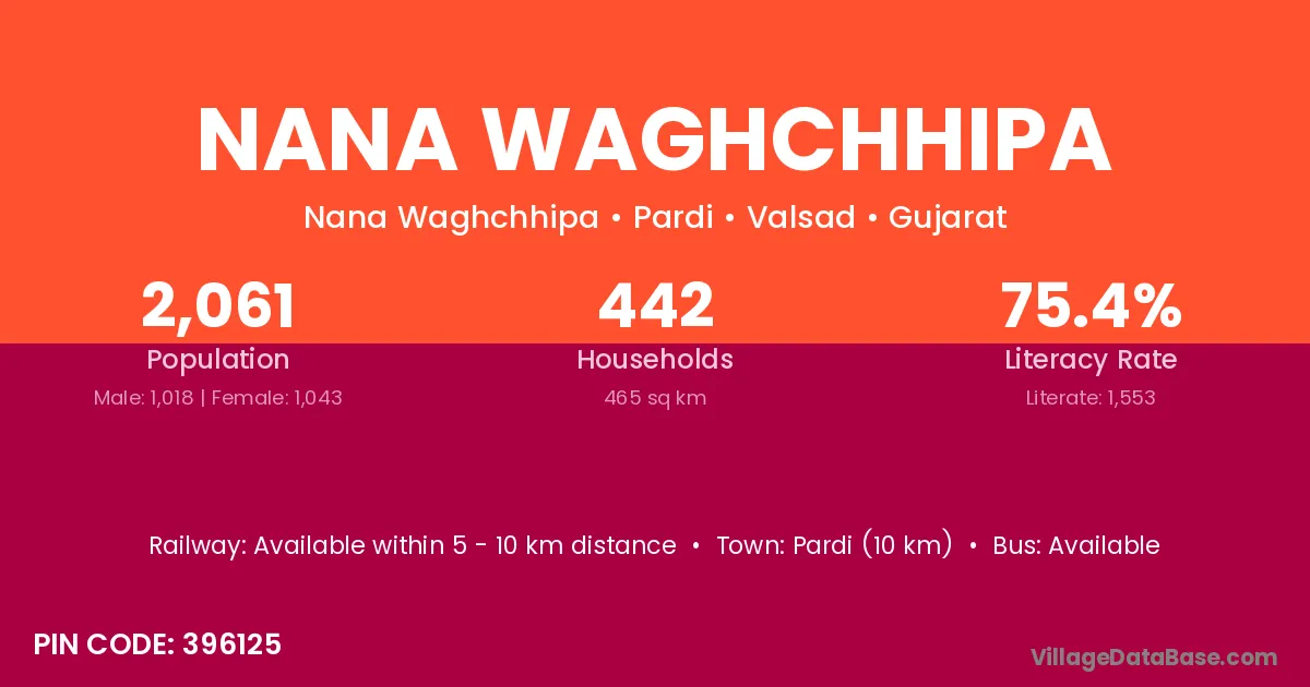 Pardi (10 km) is the nearest town to Nana Waghchhipa village for major economic activities and is located approximately 10 km away.