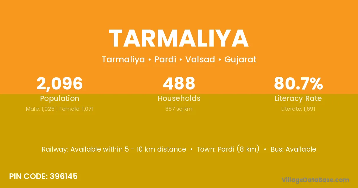 Pardi (8 km) is the nearest town to Tarmaliya village for major economic activities and is located approximately 8 km away.