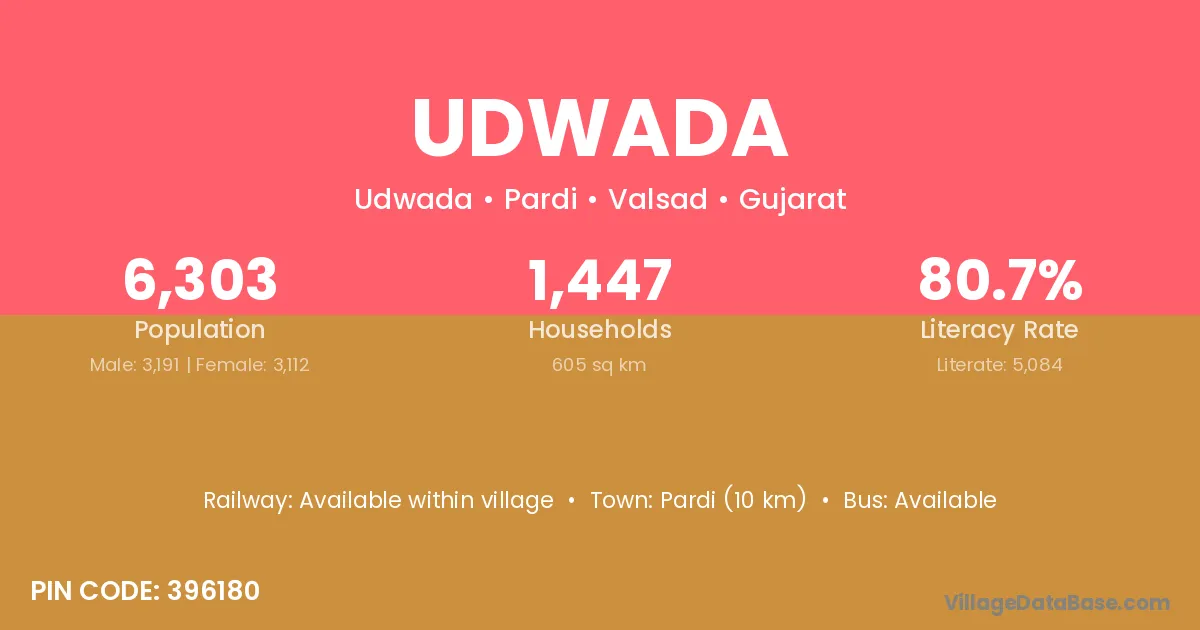Pardi (10 km) is the nearest town to Udwada village for major economic activities and is located approximately 10 km away.
