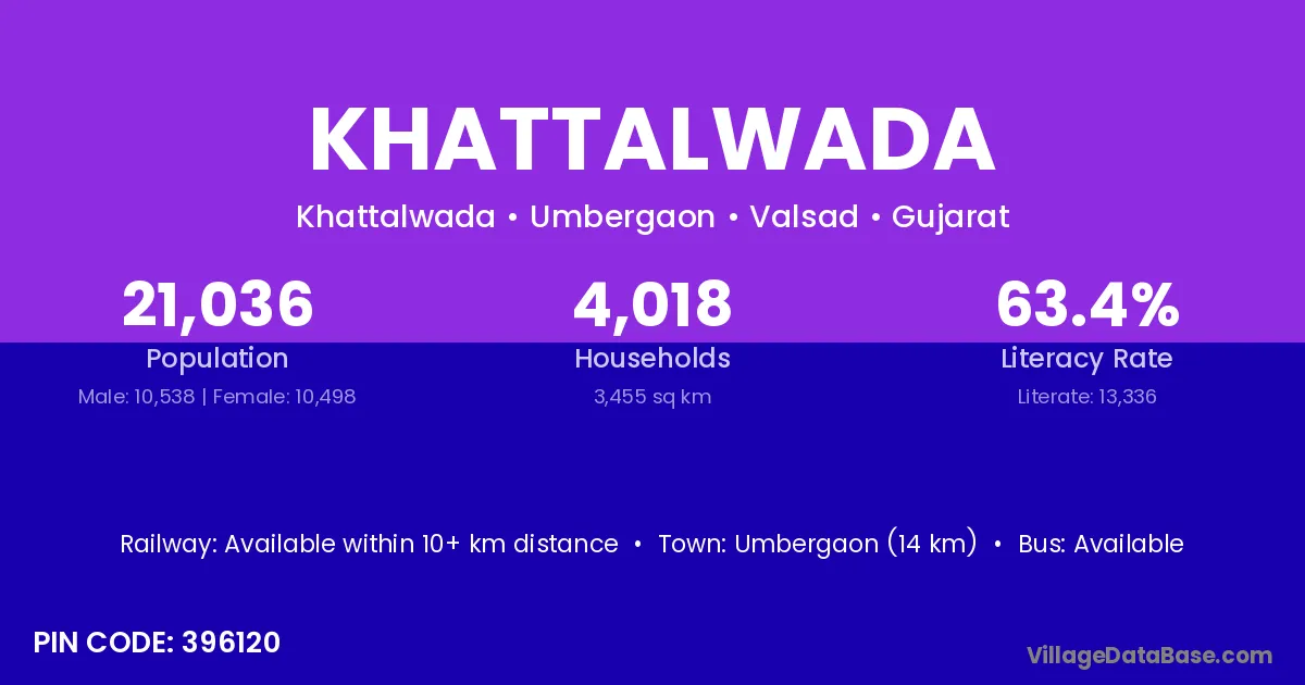 Umbergaon (14 km) is the nearest town to Khattalwada village for major economic activities and is located approximately 14 km away.