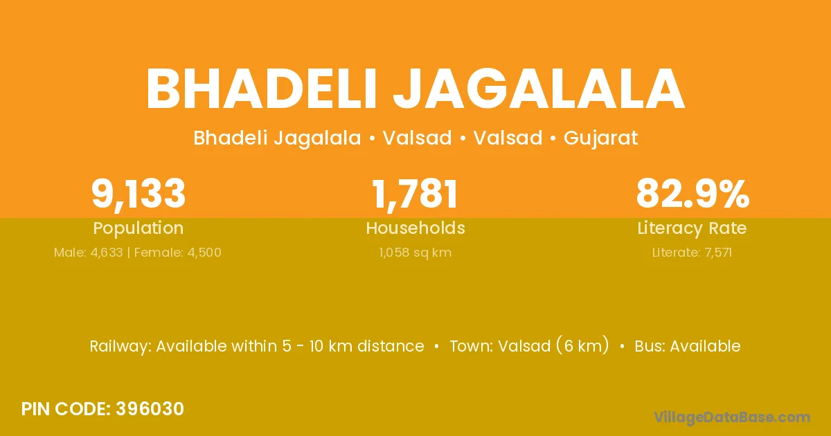 Valsad (6 km) is the nearest town to Bhadeli Jagalala village for major economic activities and is located approximately 6 km away.