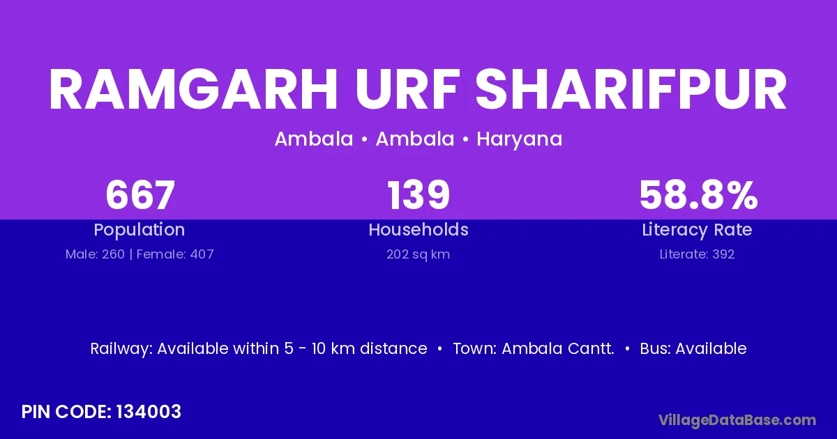 Ramgarh Urf Sharifpur village has a total population of 667 people, of which 260 are males and 407 are females.