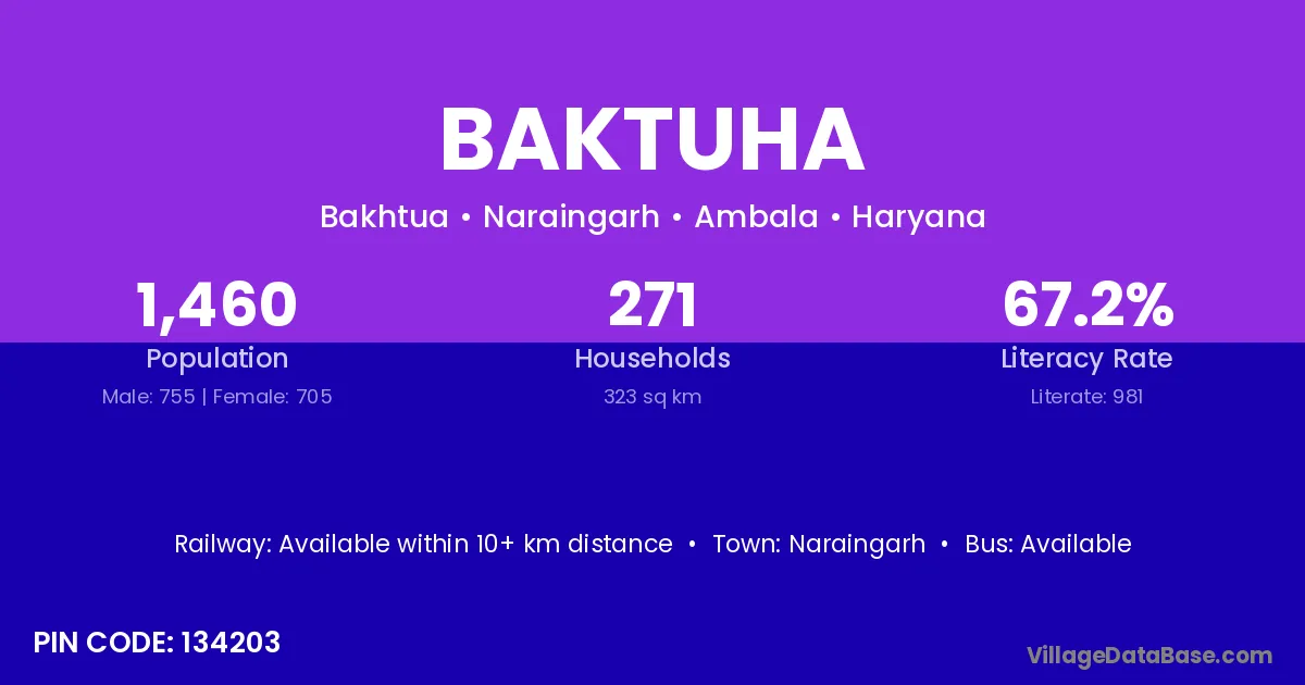 Baktuha village has a total population of 1,460 people, of which 755 are males and 705 are females.