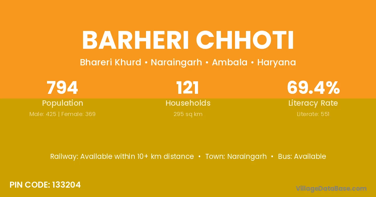 Barheri Chhoti village has a total population of 794 people, of which 425 are males and 369 are females.