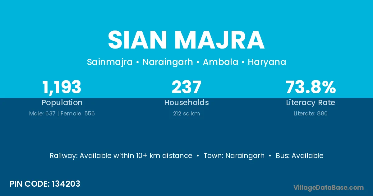Sian Majra village has a total population of 1,193 people, of which 637 are males and 556 are females.