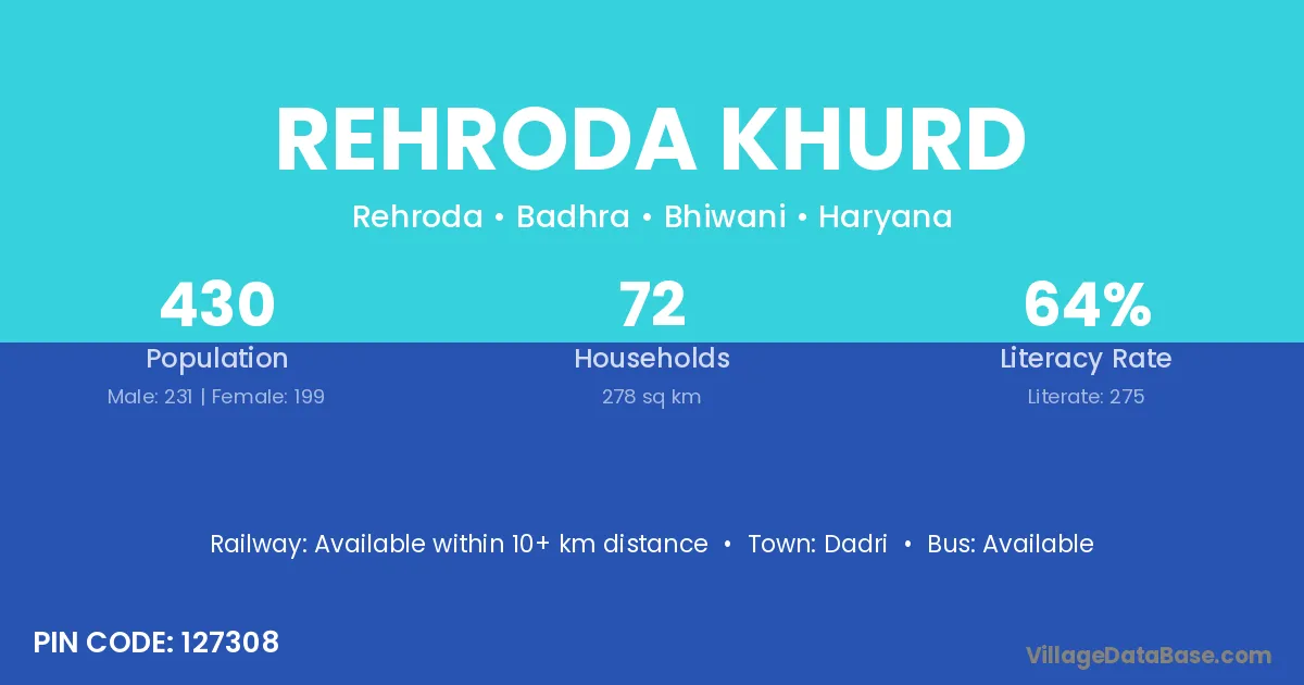 Rehroda Khurd village has a total population of 430 people, of which 231 are males and 199 are females.