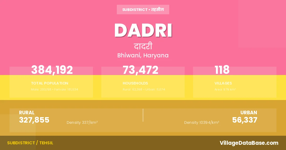 According to the 2011 census The total area of Dadri Tehsil is 979 km², with a population of 384192 people. The population density is 393 inhabitants per square kilometre, and there are approximately 73472 houses in the sub district.