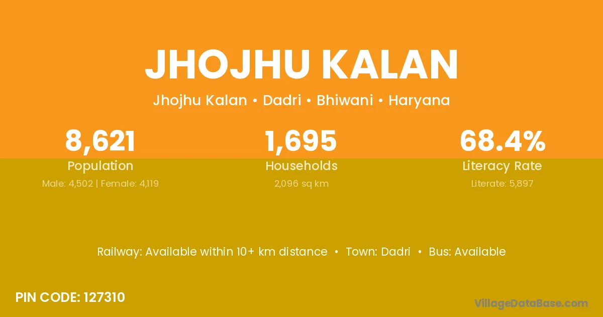 Jhojhu Kalan village has a total population of 8,621 people, of which 4,502 are males and 4,119 are females.