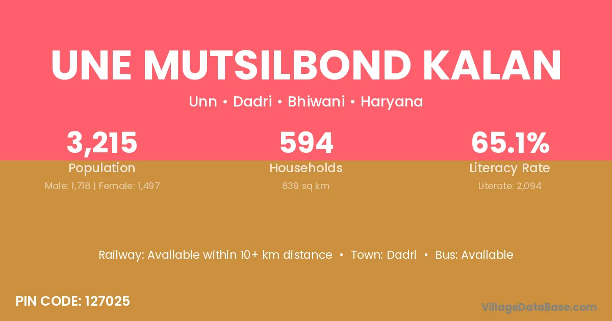 Une Mutsilbond Kalan village has a total population of 3,215 people, of which 1,718 are males and 1,497 are females.