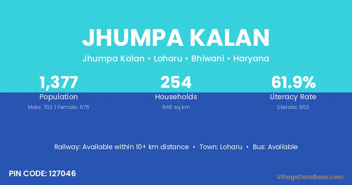 Jhumpa Kalan village has a total population of 1,377 people, of which 702 are males and 675 are females.