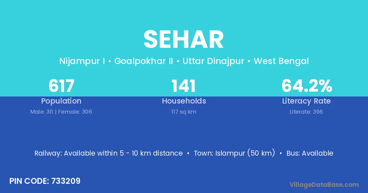 Sehar village has a total population of 1,470 people, of which 732 are males and 738 are females.