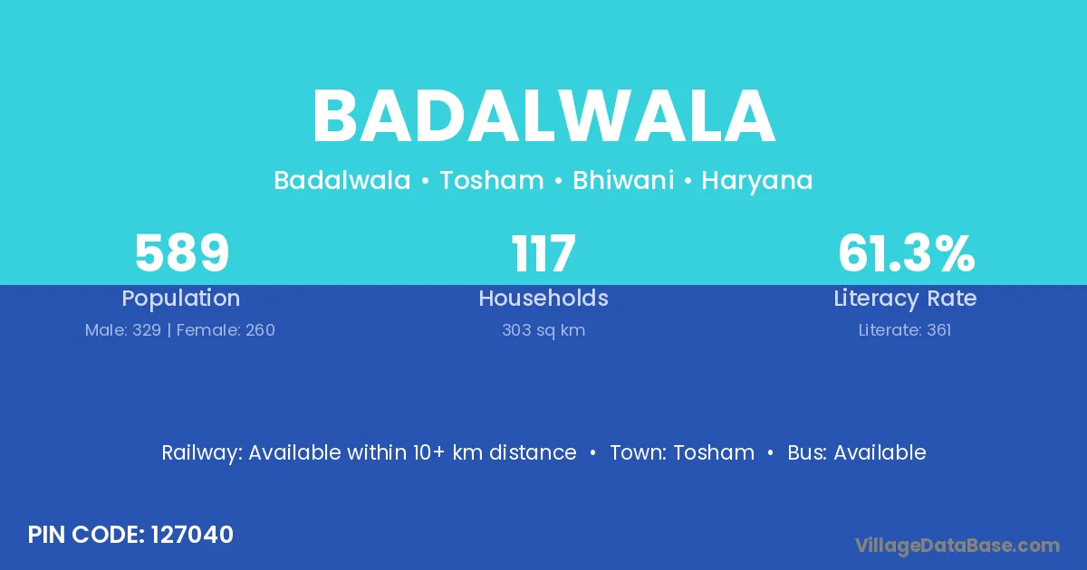 Badalwala village has a total population of 589 people, of which 329 are males and 260 are females.