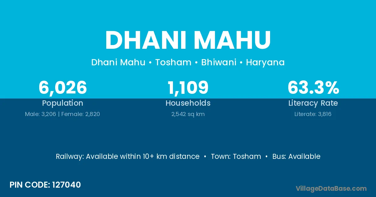 Dhani Mahu village has a total population of 6,026 people, of which 3,206 are males and 2,820 are females.