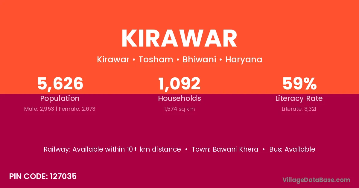 Kirawar village has a total population of 5,626 people, of which 2,953 are males and 2,673 are females.