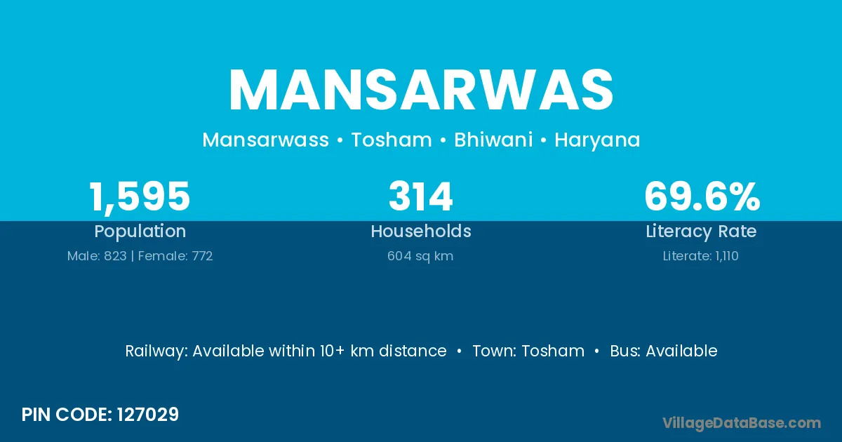 Mansarwas village has a total population of 1,595 people, of which 823 are males and 772 are females.