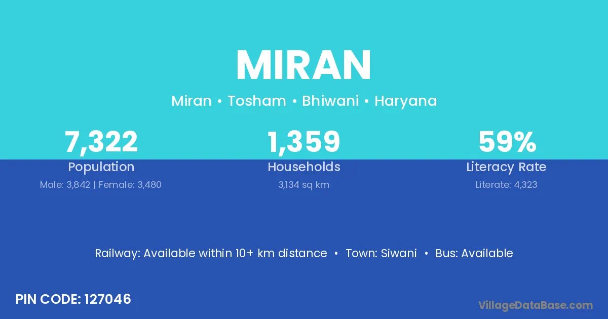 Miran village has a total population of 7,322 people, of which 3,842 are males and 3,480 are females.