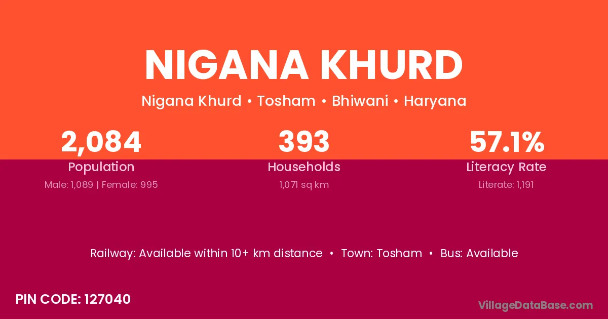 Nigana Khurd village has a total population of 2,084 people, of which 1,089 are males and 995 are females.