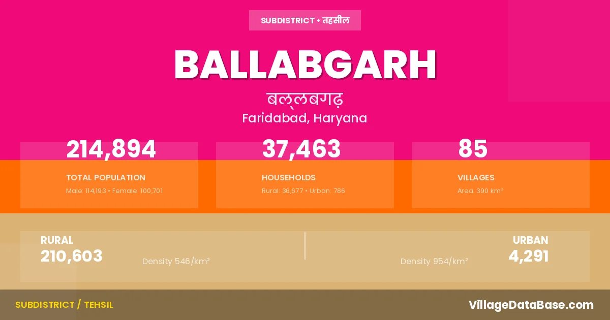 According to the 2011 census The total area of Ballabgarh Tehsil is 390 km², with a population of 214894 people. The population density is 551 inhabitants per square kilometre, and there are approximately 37463 houses in the sub district.