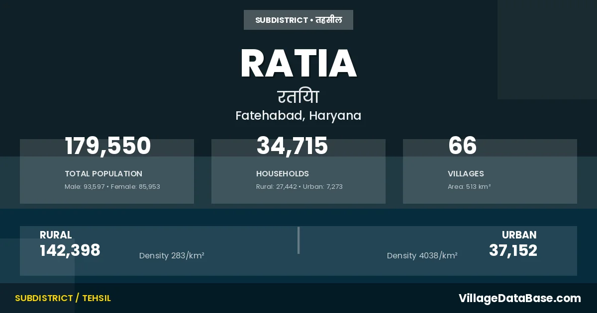 According to the 2011 census The total area of Ratia Tehsil is 513 km², with a population of 179550 people. The population density is 350 inhabitants per square kilometre, and there are approximately 34715 houses in the sub district.