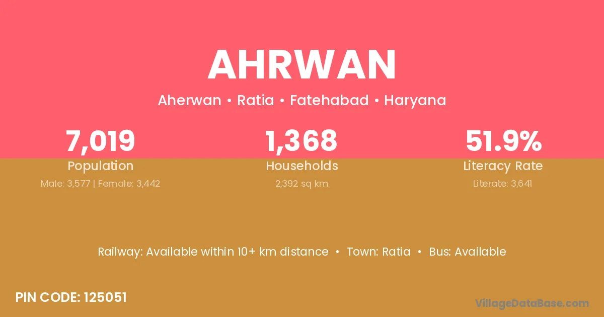 Ahrwan village has a total population of 7,019 people, of which 3,577 are males and 3,442 are females.
