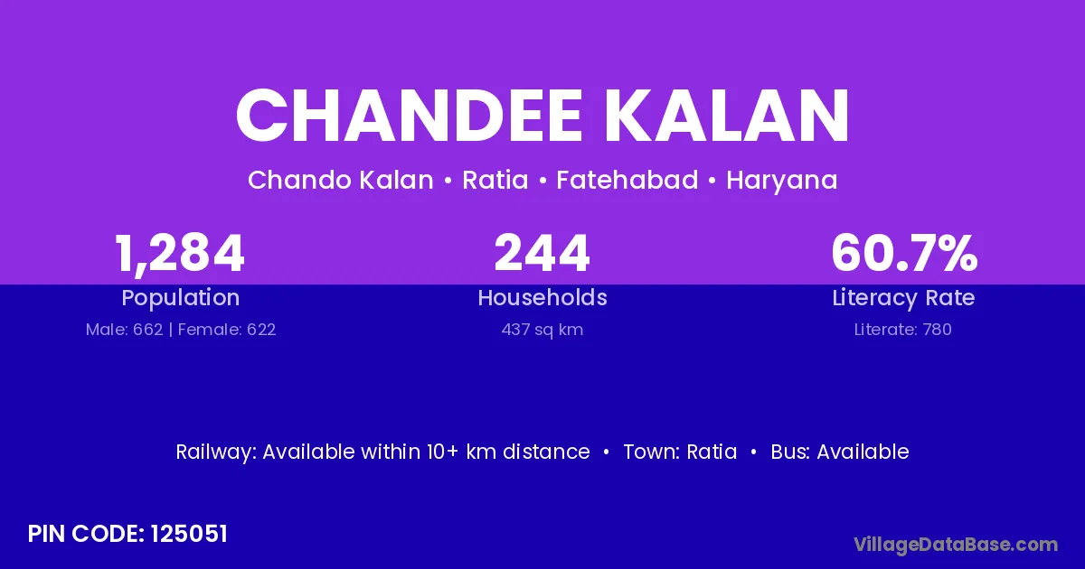 Chandee Kalan village has a total population of 1,284 people, of which 662 are males and 622 are females.
