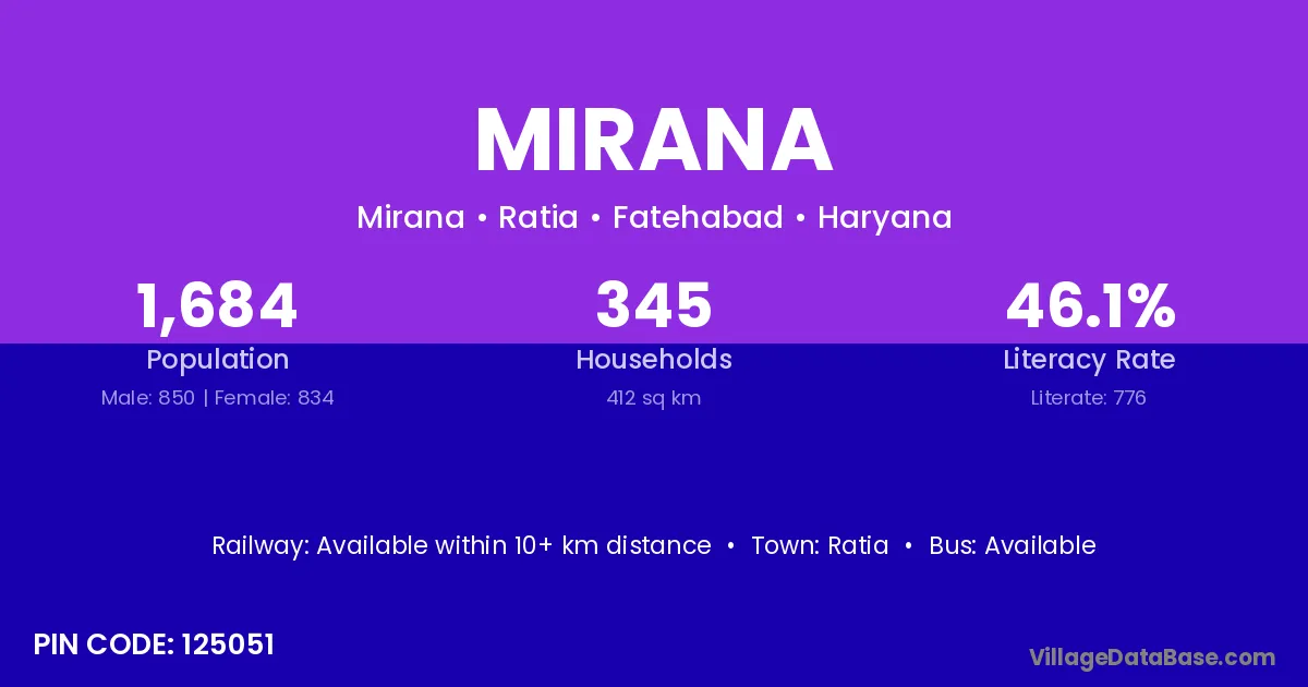 According to Census 2011 information, the village code of Mirana village is 125051.