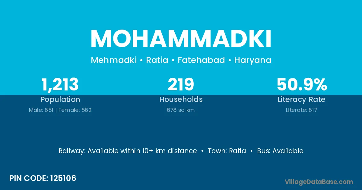 Mohammadki village has a total population of 1,213 people, of which 651 are males and 562 are females.