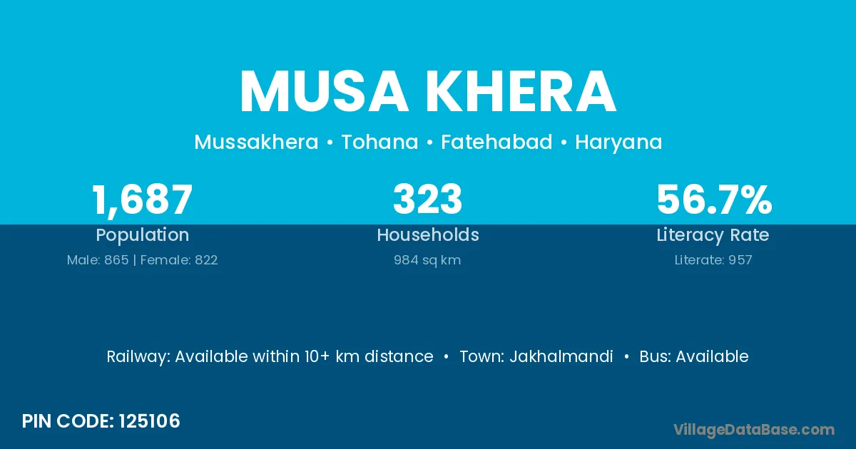Musa Khera village has a total population of 1,687 people, of which 865 are males and 822 are females.