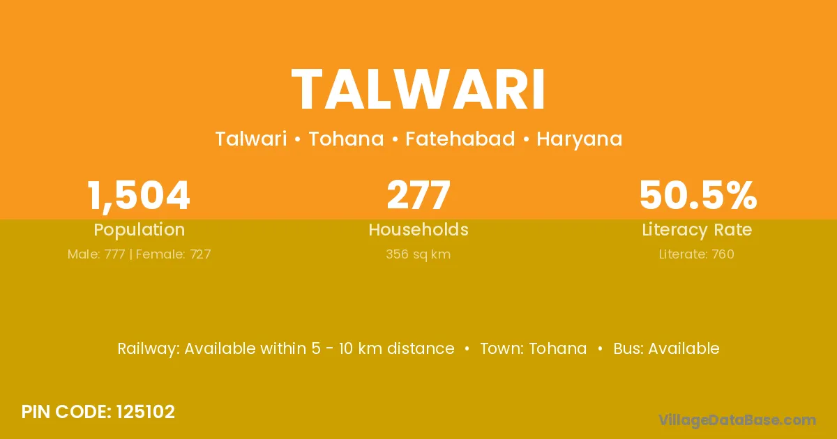 Talwari village has a total population of 1,504 people, of which 777 are males and 727 are females.