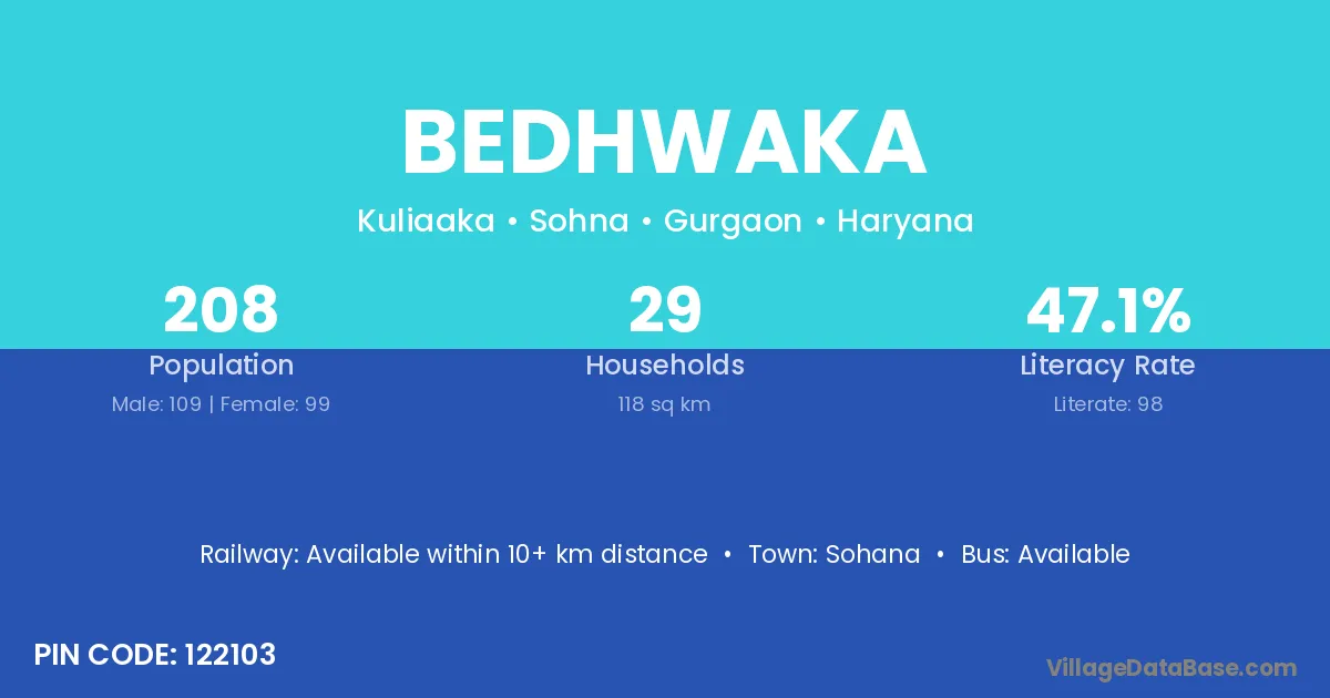 Bedhwaka village has a total population of 208 people, of which 109 are males and 99 are females.
