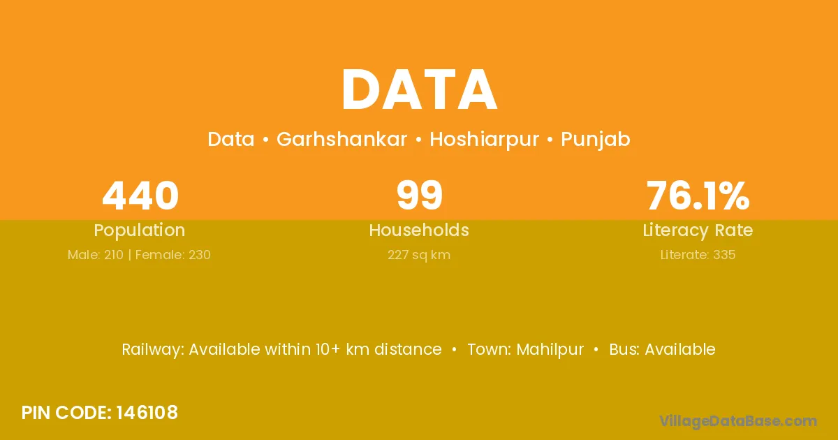 The literacy rate of Data village is 53.81%. Male literacy stands at 62.04% and female literacy at 44.31%.