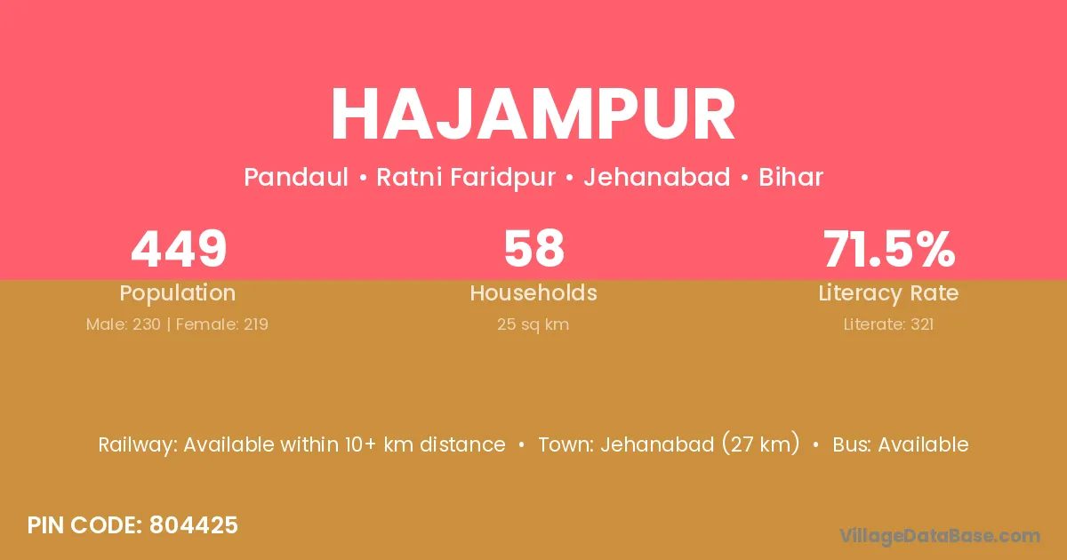 Hajampur village has a total population of 3,404 people, of which 1,823 are males and 1,581 are females.