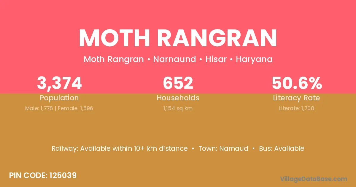 Moth Rangran village has a total population of 3,374 people, of which 1,778 are males and 1,596 are females.