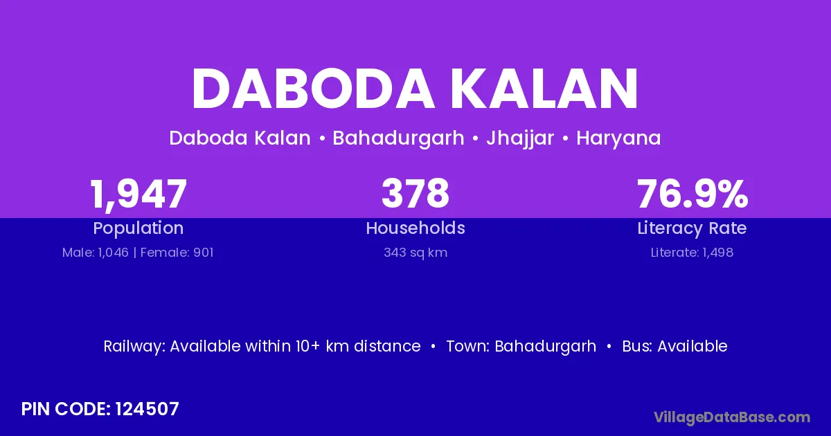 Daboda Kalan village has a total population of 1,947 people, of which 1,046 are males and 901 are females.