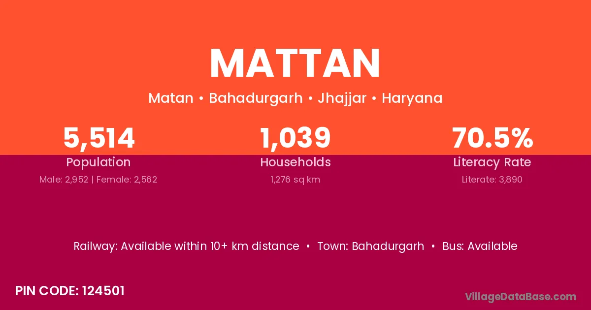 Mattan village has a total population of 5,514 people, of which 2,952 are males and 2,562 are females.