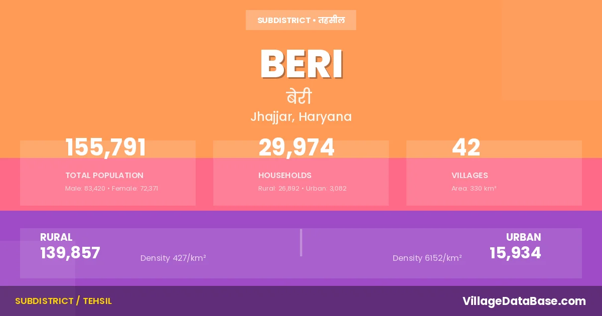 According to the 2011 census The total area of Beri Tehsil is 330 km², with a population of 155791 people. The population density is 472 inhabitants per square kilometre, and there are approximately 29974 houses in the sub district.