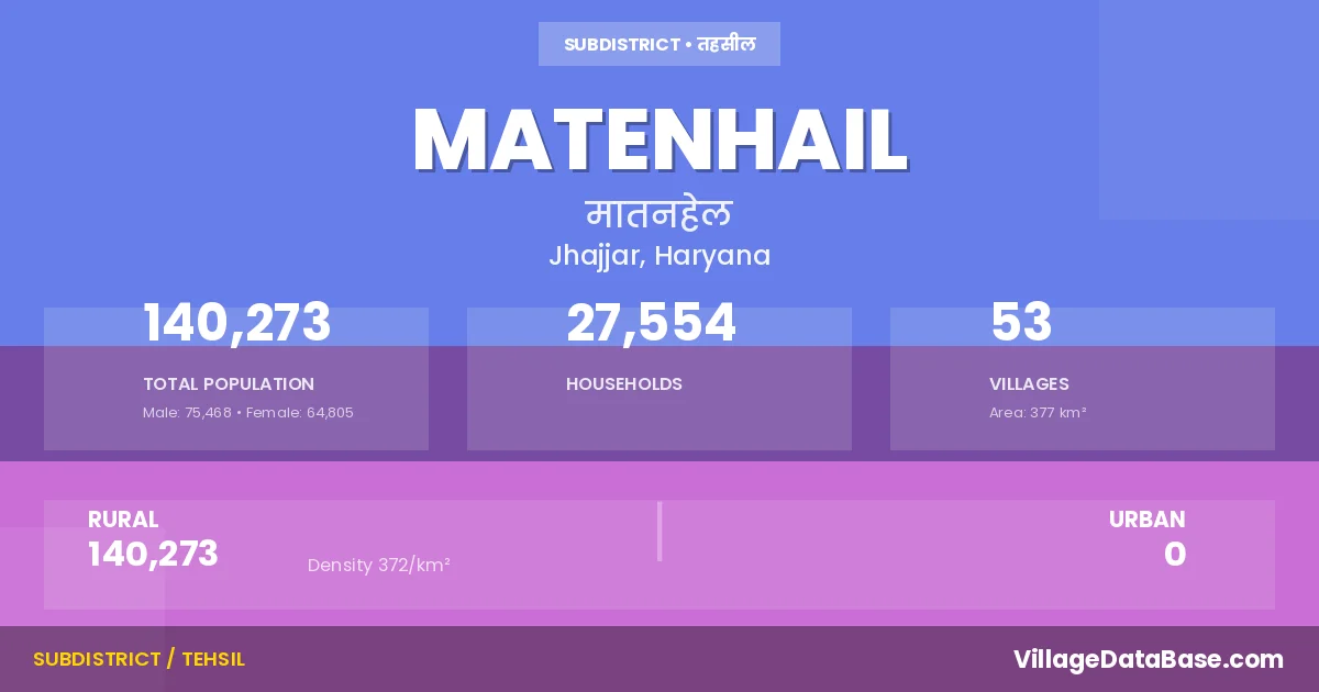 Matenhail is a town and Tehsil in the Jhajjar district of the Haryana. In India, a Tehsil is a subdivision of a district responsible for the administration and revenue collection of a specific area within the district. Tehsils play a crucial role in the local governance structure, contributing significantly to the development and administration of their communities.