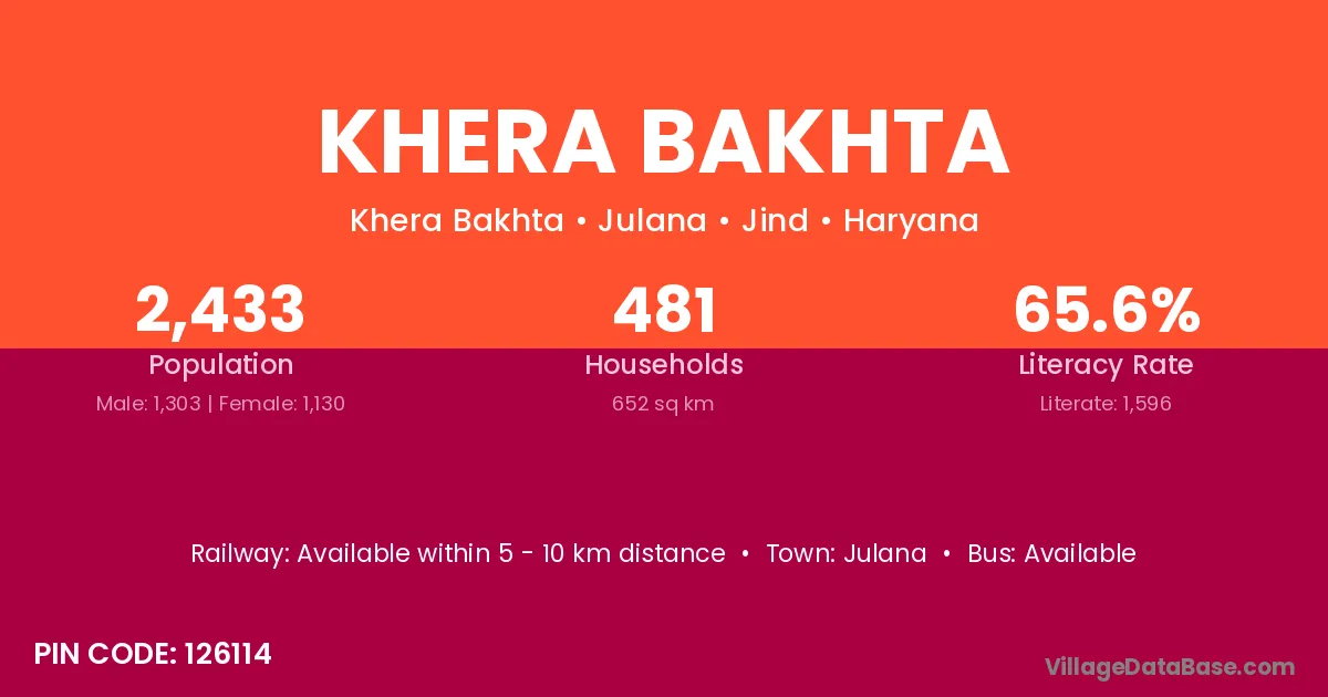 Khera Bakhta village has a total population of 2,433 people, of which 1,303 are males and 1,130 are females.